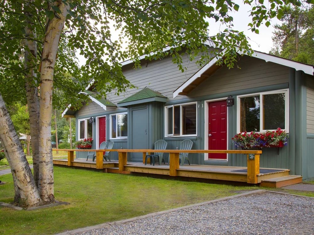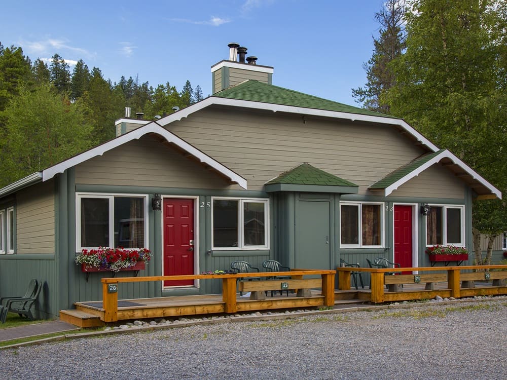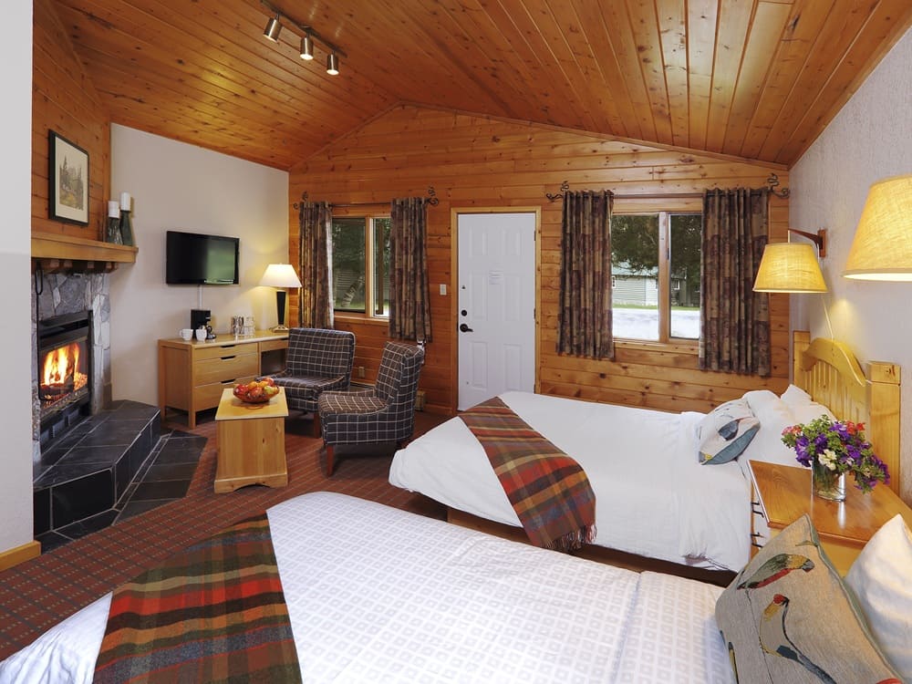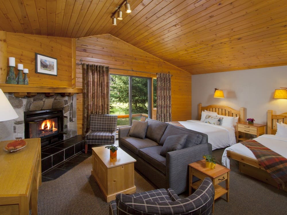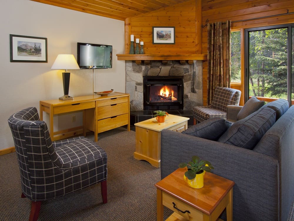 The open concept Chalet Room features a cozy seating area and sleeping area by the wood burning fireplace with charming pine-finished vaulted ceilings creating a warm Rocky Mountain ambience. Located on the front of the four-plex building, it has a private entrance and verandah with outdoor seating.