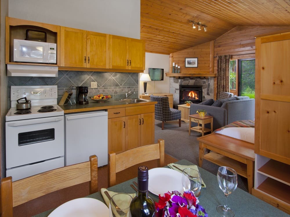 The Chalet Studio is a more spacious open concept unit which includes the sleeping area, a kitchen with eating area and living room with cozy seating arrangement by wood burning fireplace and a secluded forest view. Located on the meadow side of the four-plex building, it features a private verandah with outdoor seating, making it a comfortable retreat in nature.