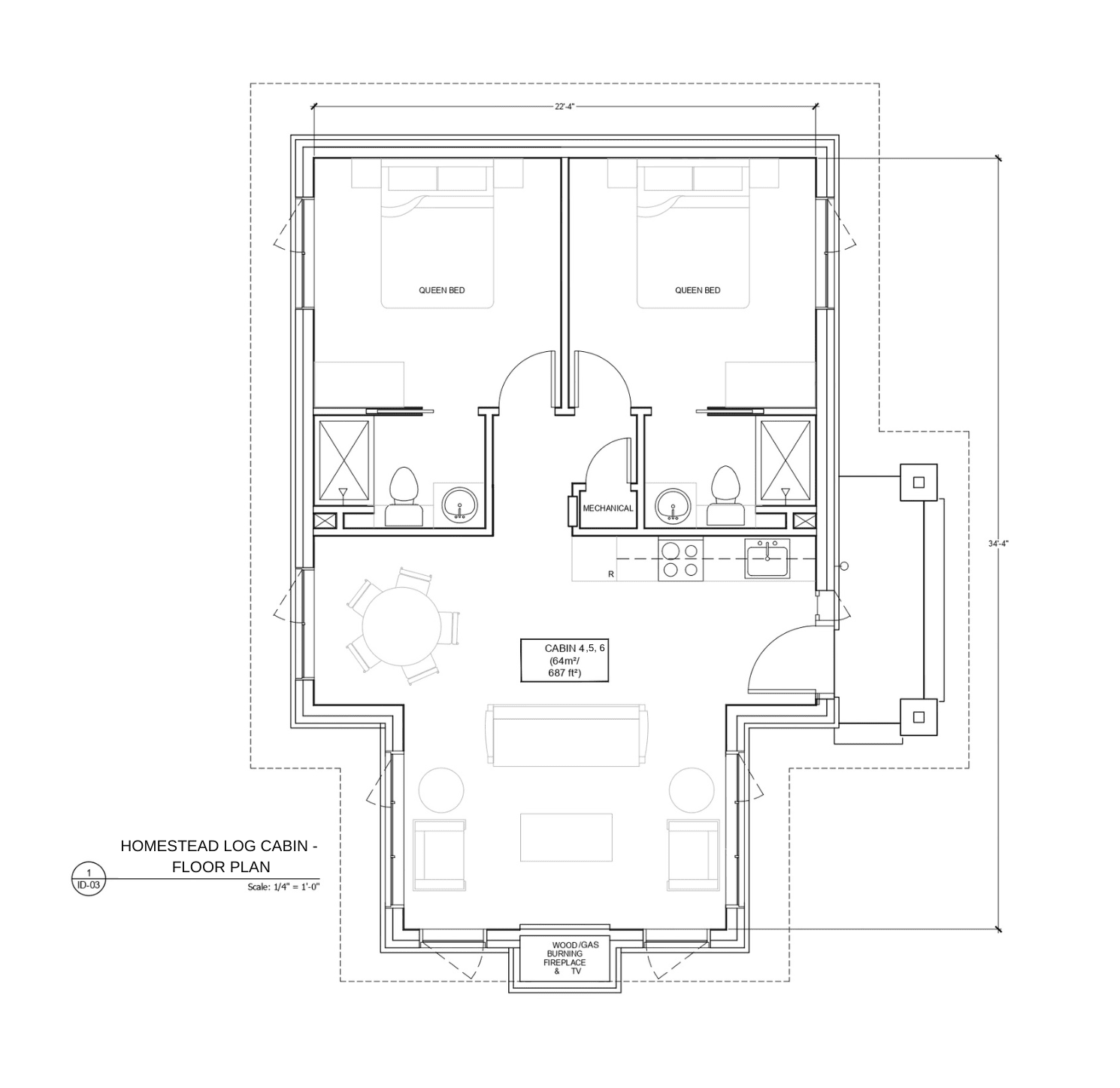 ( Previously Signal Cabin ) These spacious log cabins are freestanding two bedroom units and are the newest addition to our Signature Homesteads line. Each bedroom includes a private ensuite bathroom. Featuring an open concept with kitchen, dining area and living room, this cabin offers a warm and welcoming layout – enhanced by a stone fireplace and multiple large windows allowing you to enjoy the natural surroundings.