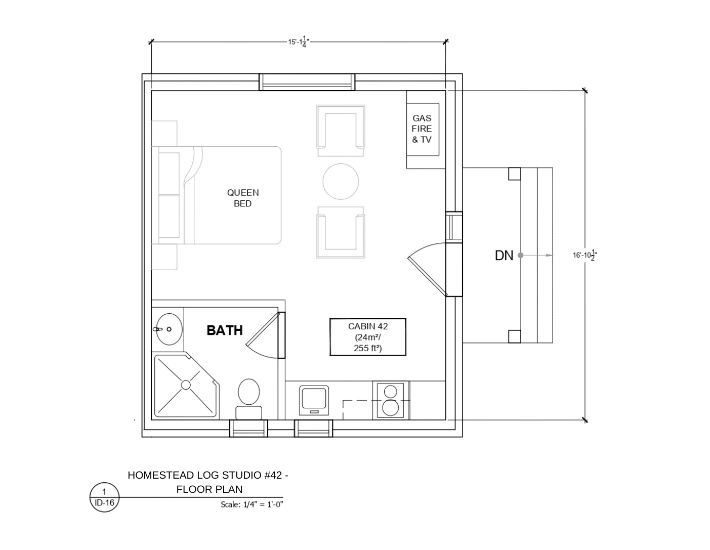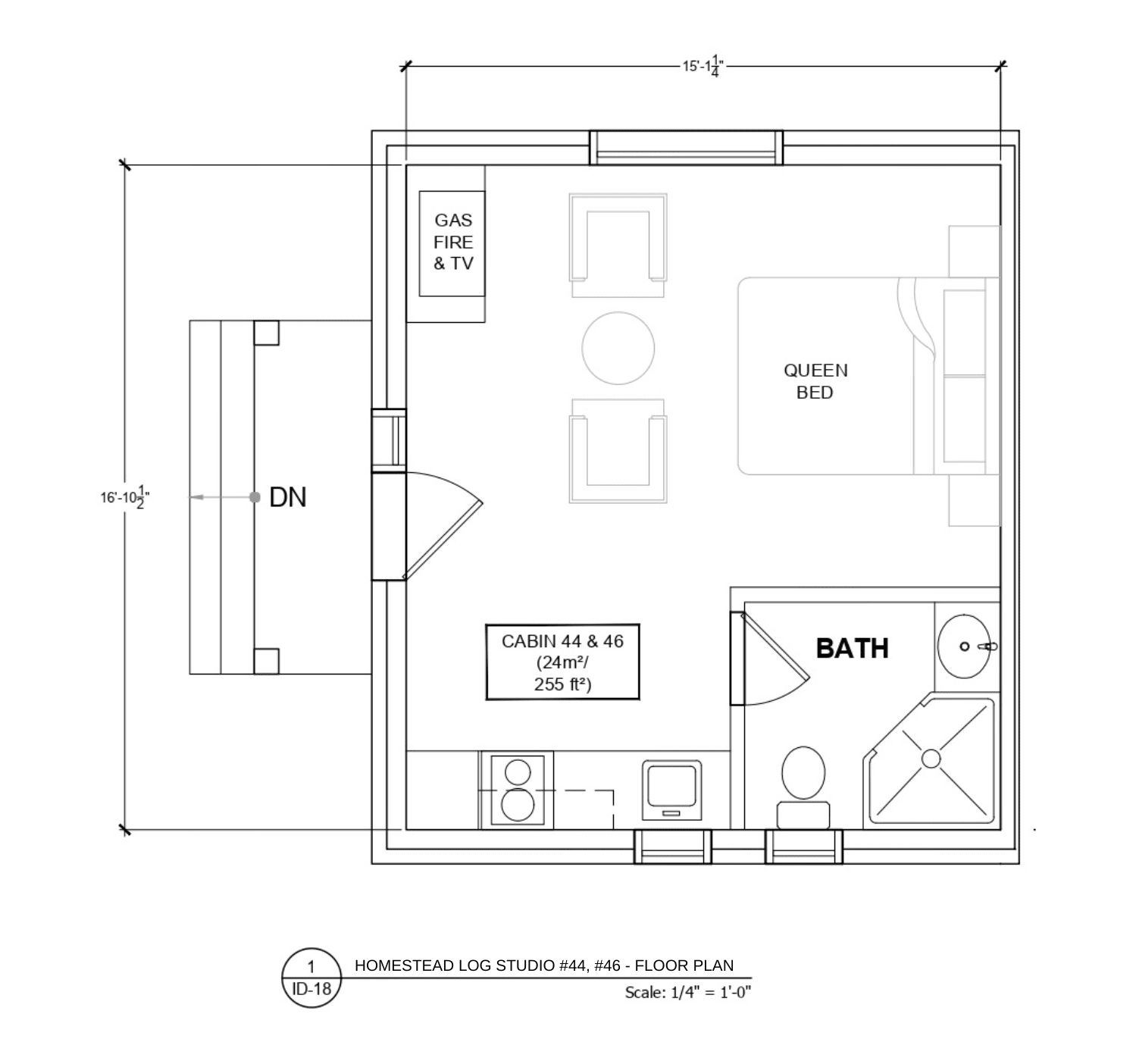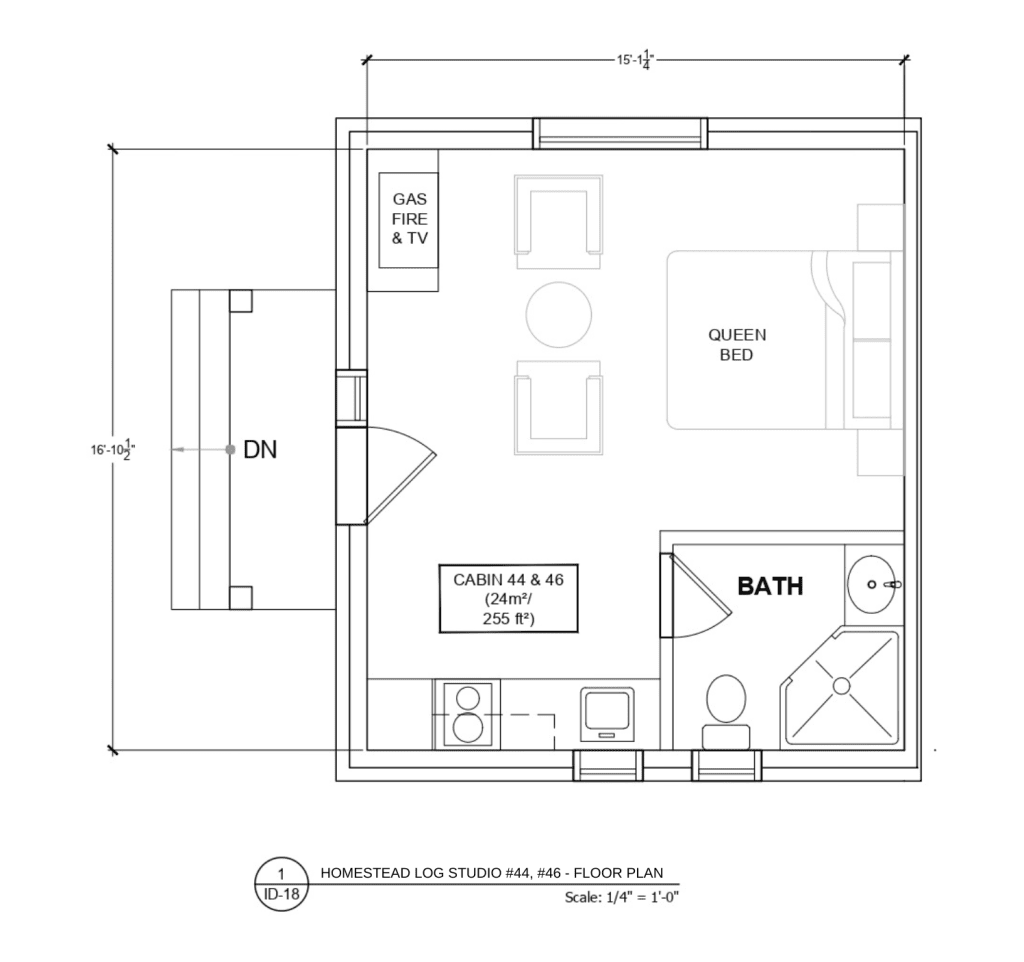 ( Previously Studio Cabin ) These semi-attached log cabins are a studio style open concept with sleeping area and cozy seating by the fireplace and a kitchenette. Each cabin has it own unique charm, offering a warm and welcoming space ideal for a relaxing stay.