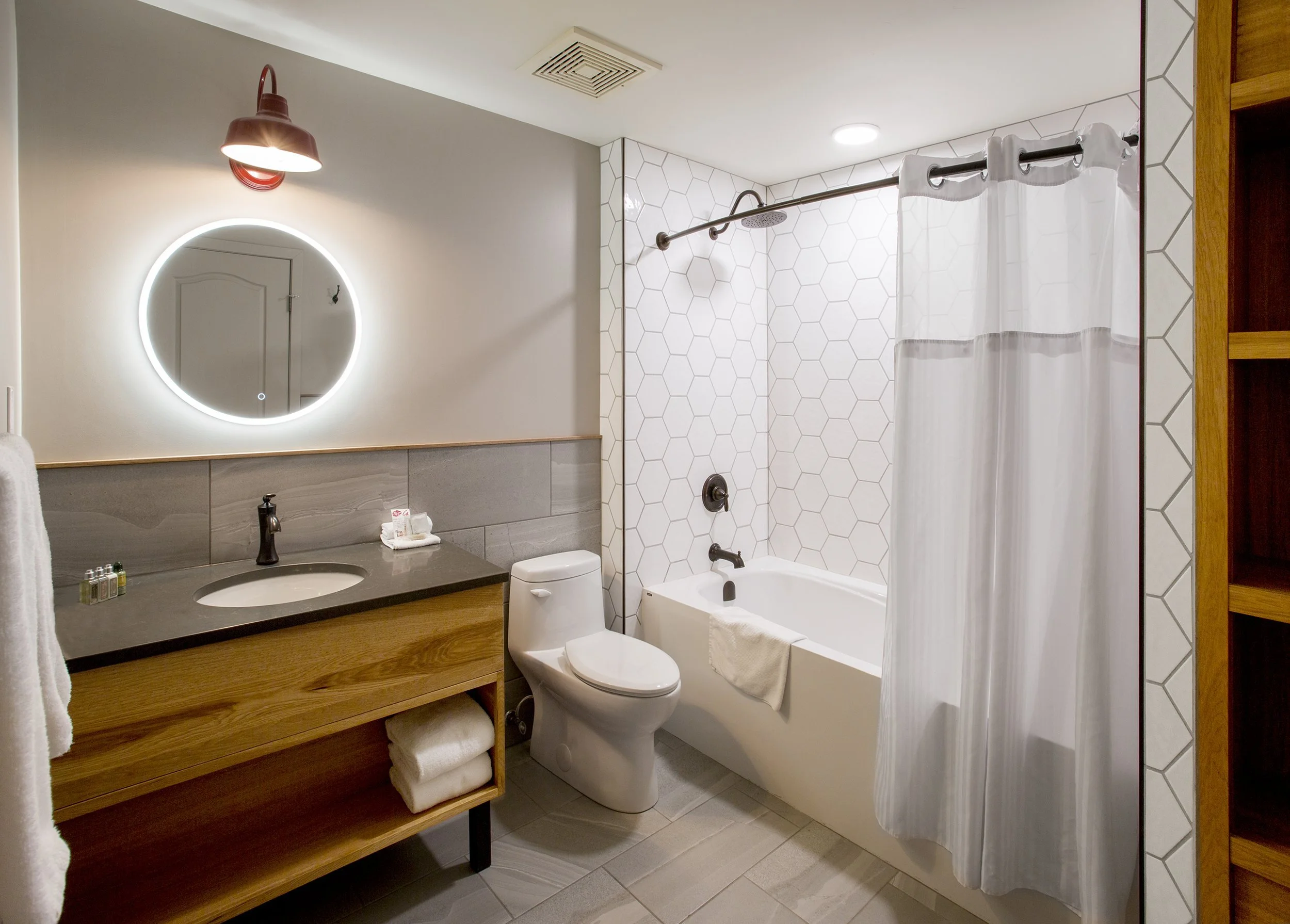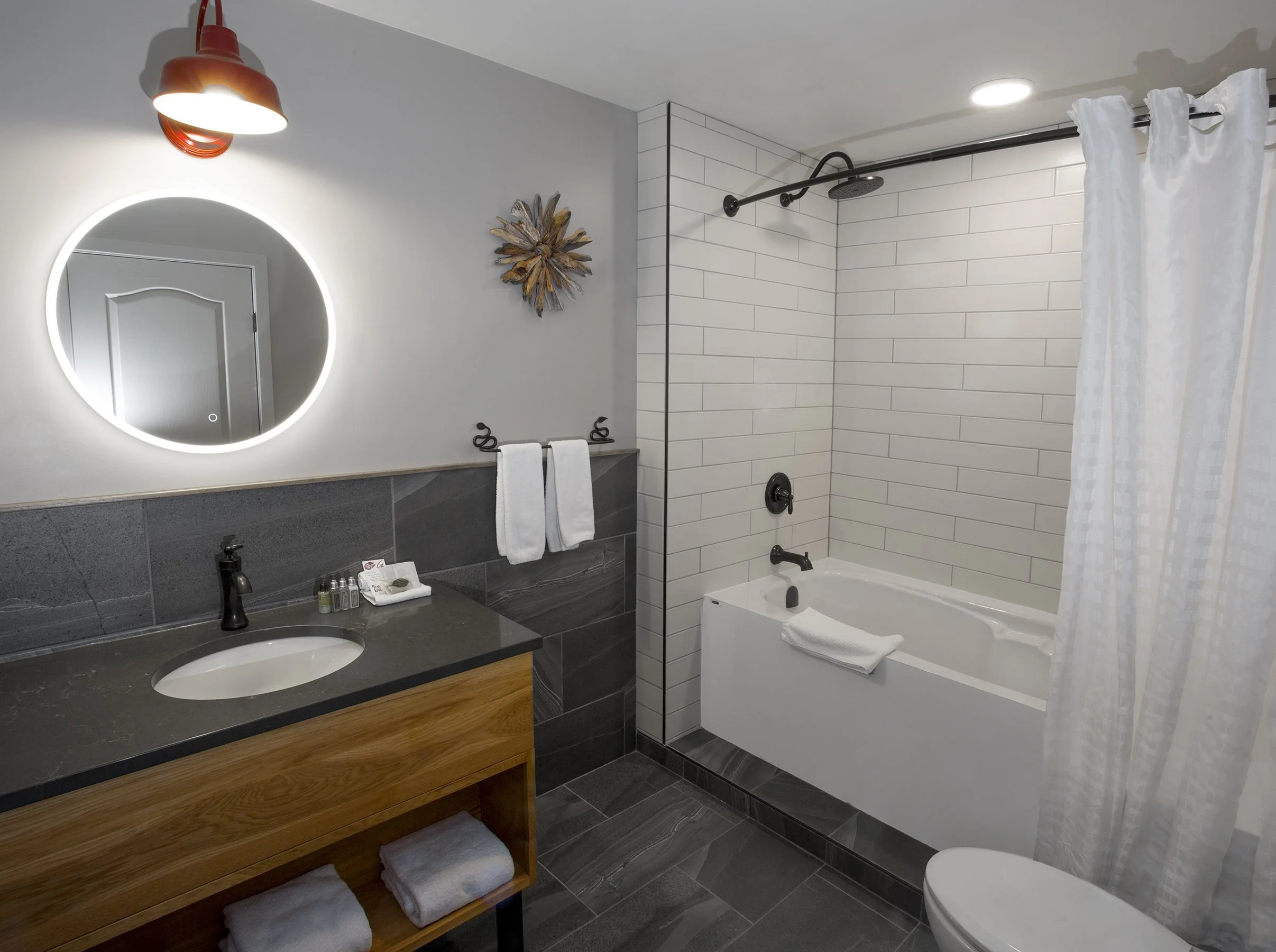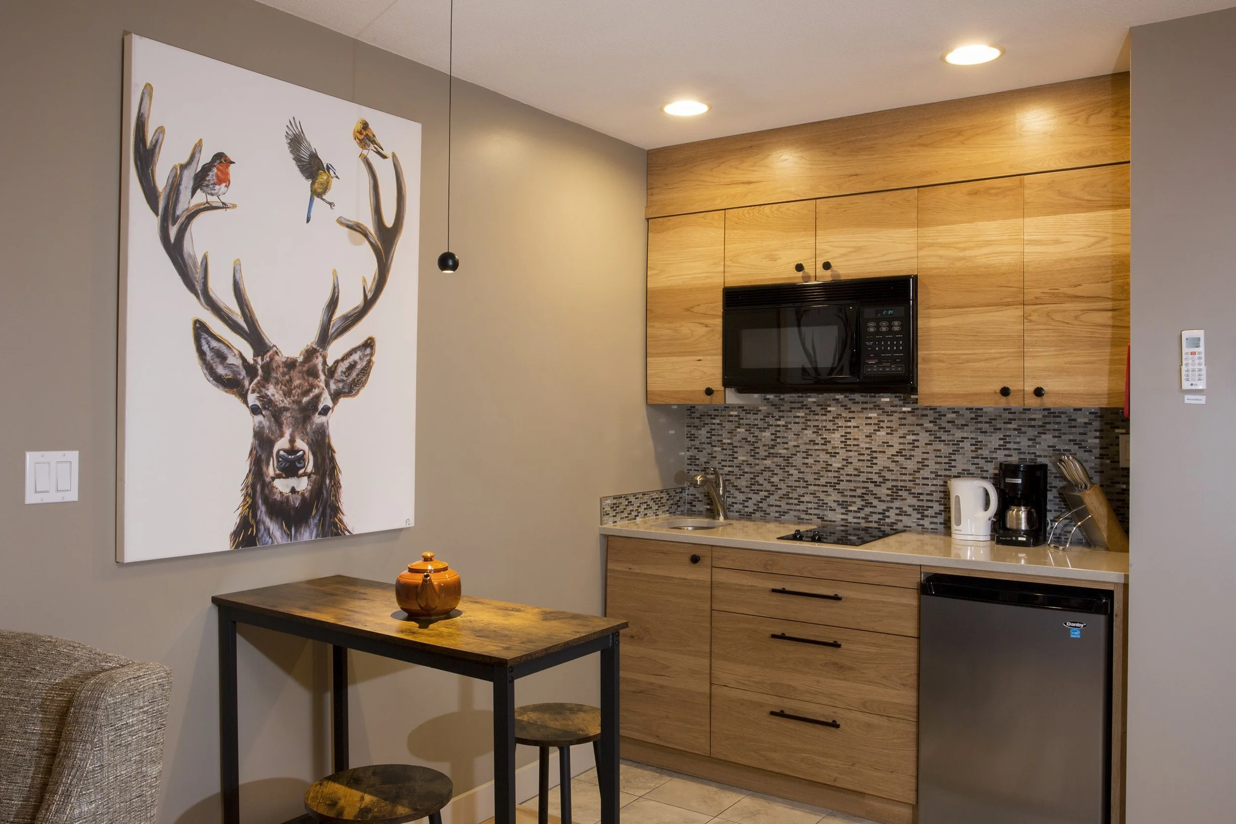 Located on the ground floor of our Main Lodge, this Studio is thoughtfully designed to accommodate guests with mobility considerations—but nothing was spared. It features our signature cozy cabin ambiance, with warm interior details throughout.